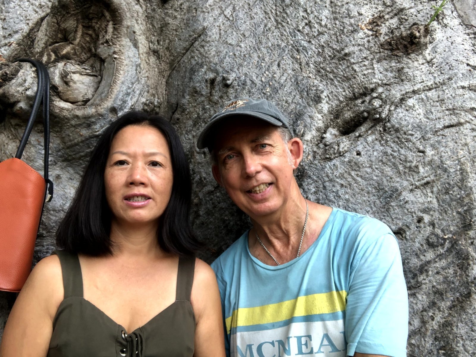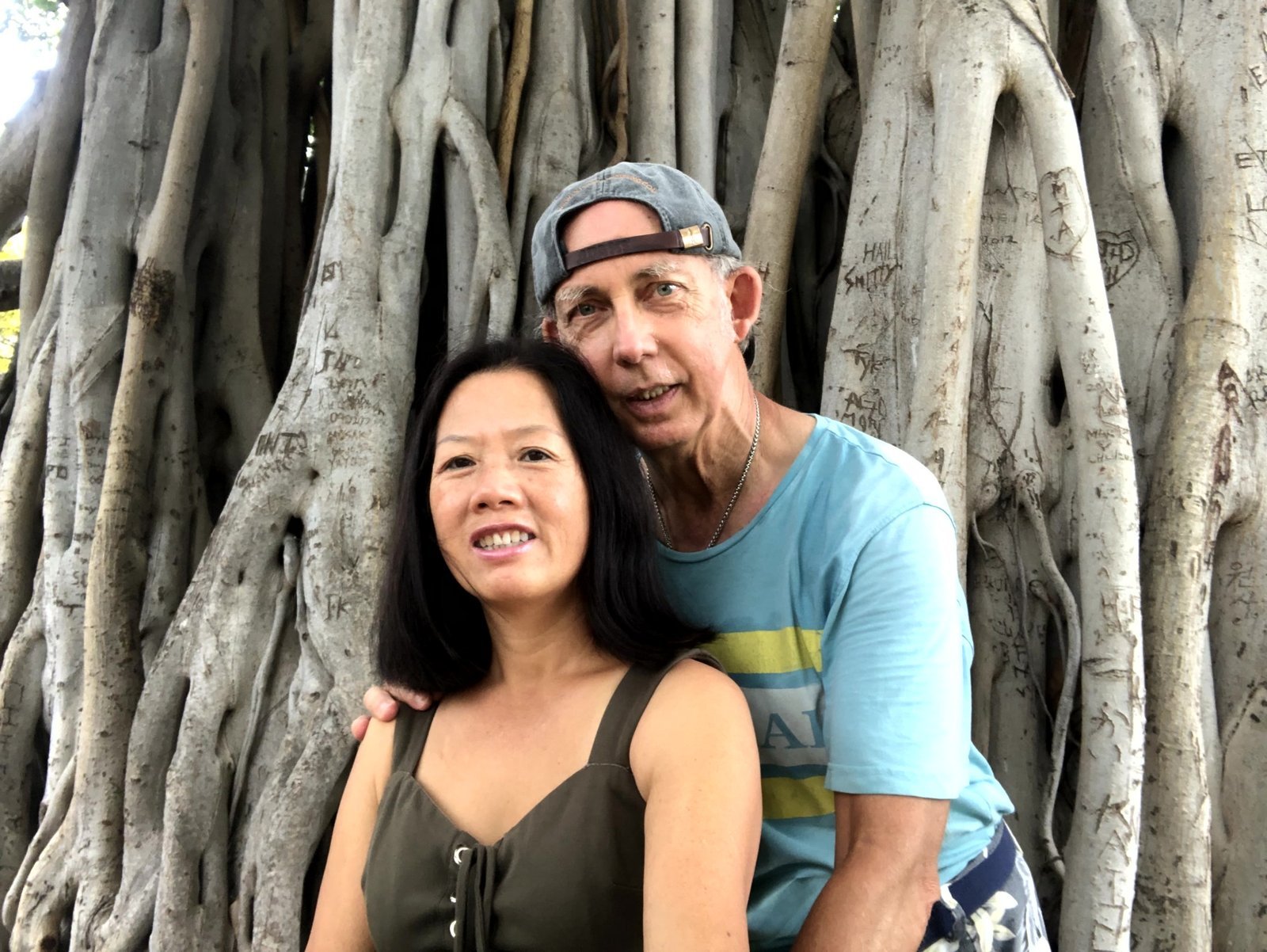 Ron and Winnie posing in Ala Moana Park, island of Oahu, Hawaii, in front of one of the banyan trees. September 25, 2022