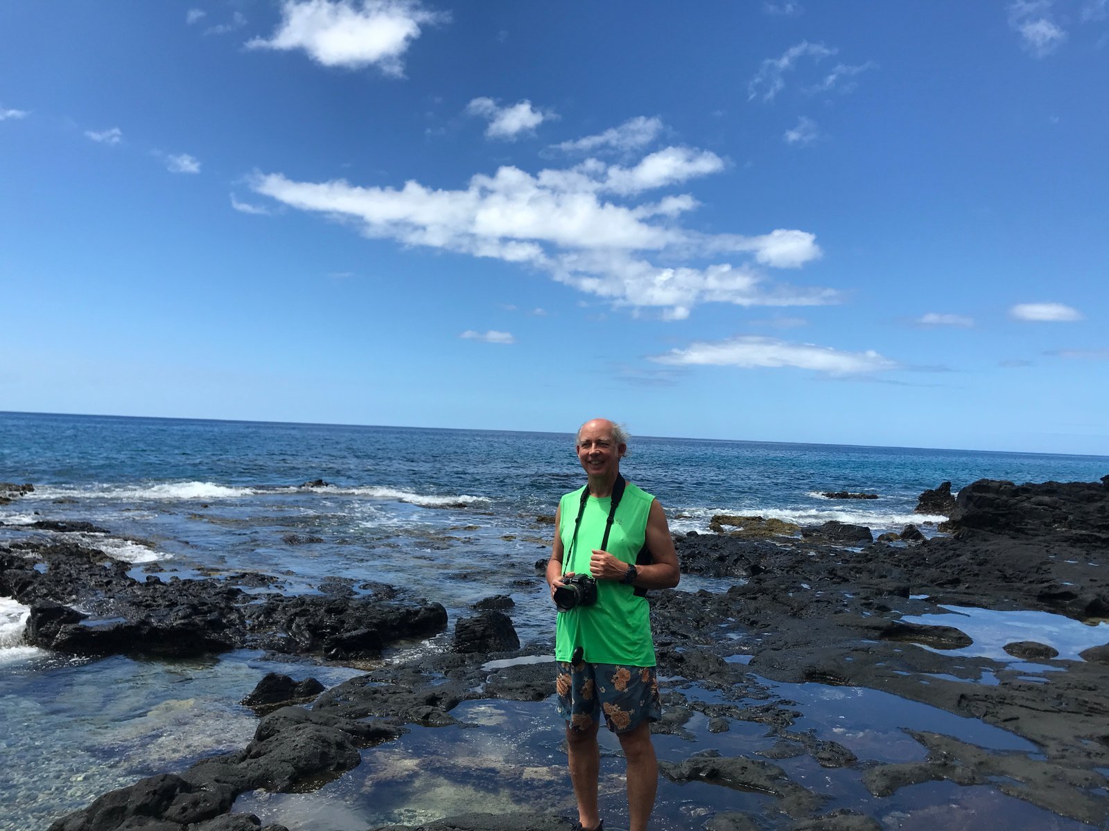 Ron on the lava rock tidal pools at Yokohama beach. Leeward (west) side of Oahu, Hawaii. Accessories include his Nikon D7100 camera.