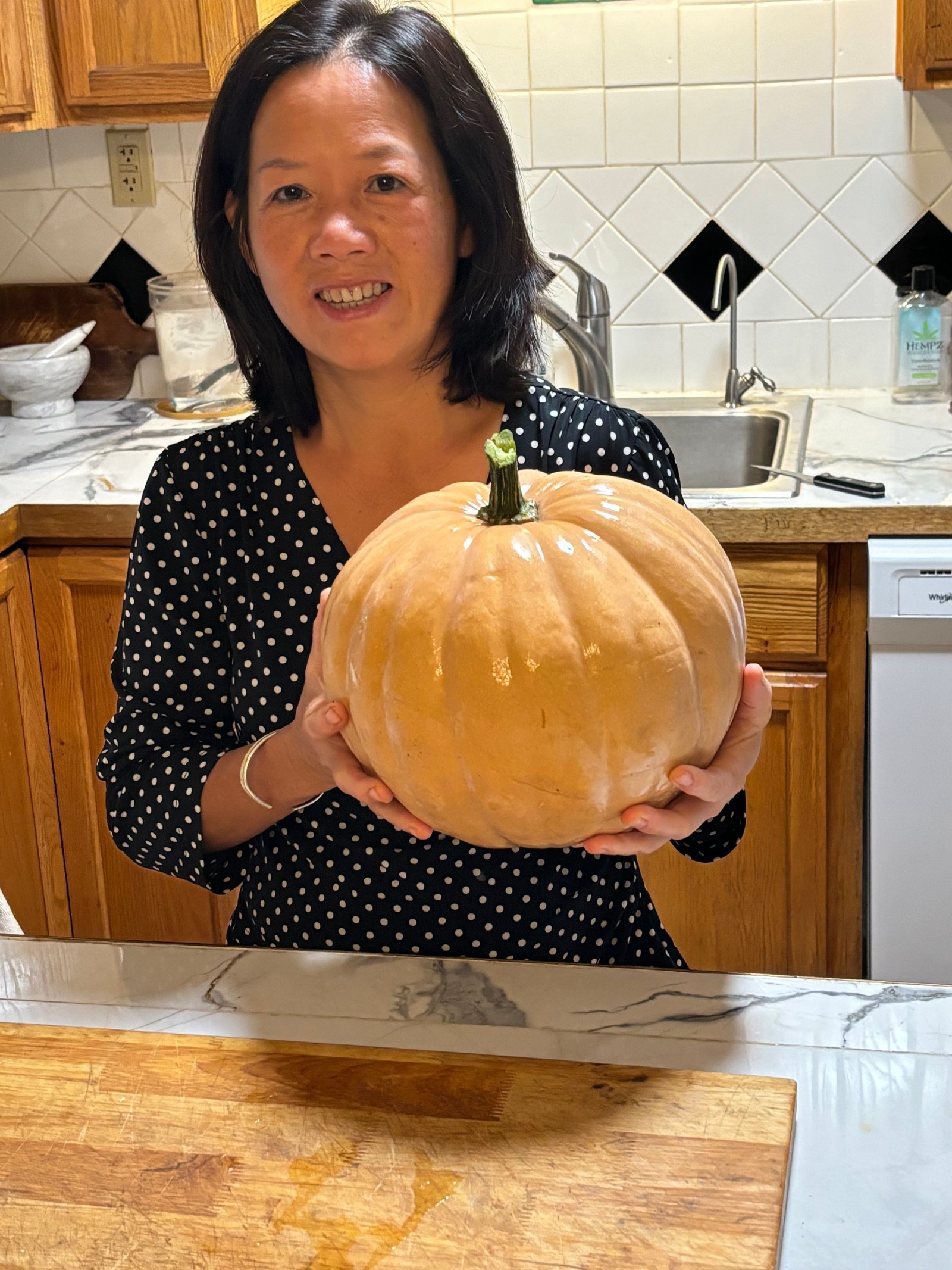One of Winnie's gardening specialties is a type of "pumpkin squash. This was one of the largest in her 2023 garden, weighting about 17 pounds.