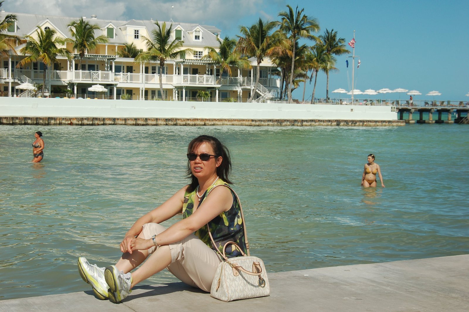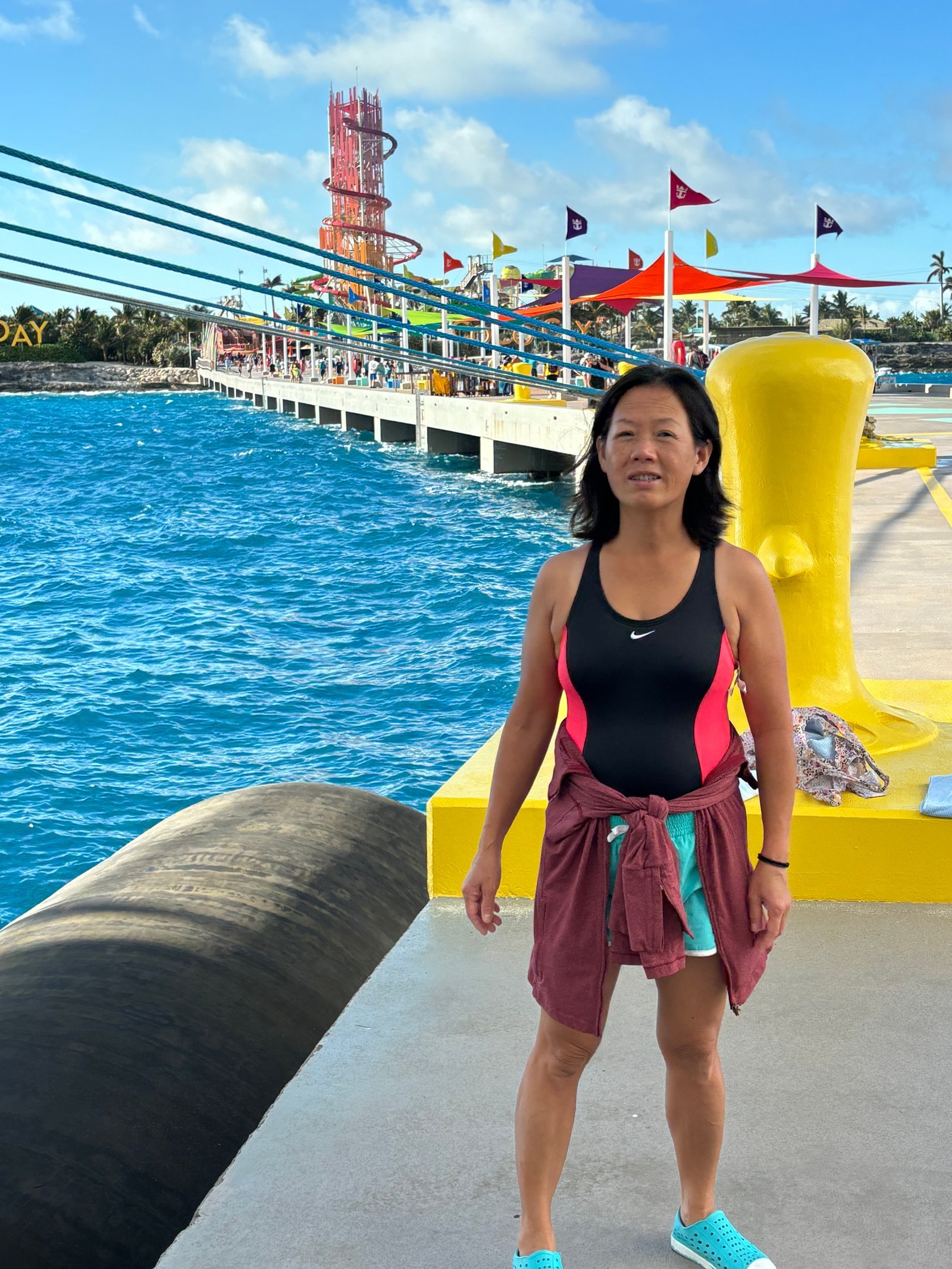 Winnie standing on the pier leading to a island resort privately owned by Royal Caribbean Lines . This was the last port visit of a ten-day Bahamas cruise. The port visit was advertised as "The perfect Day."