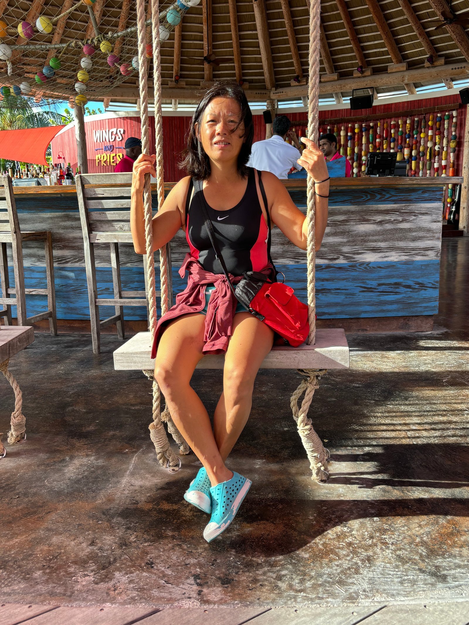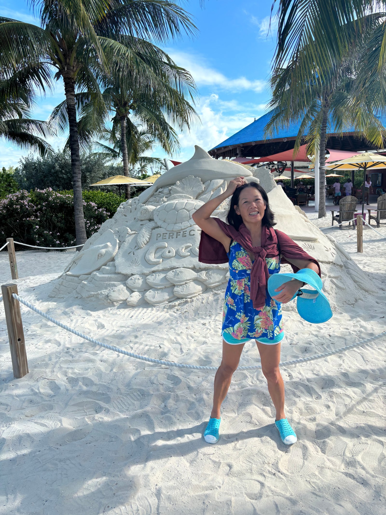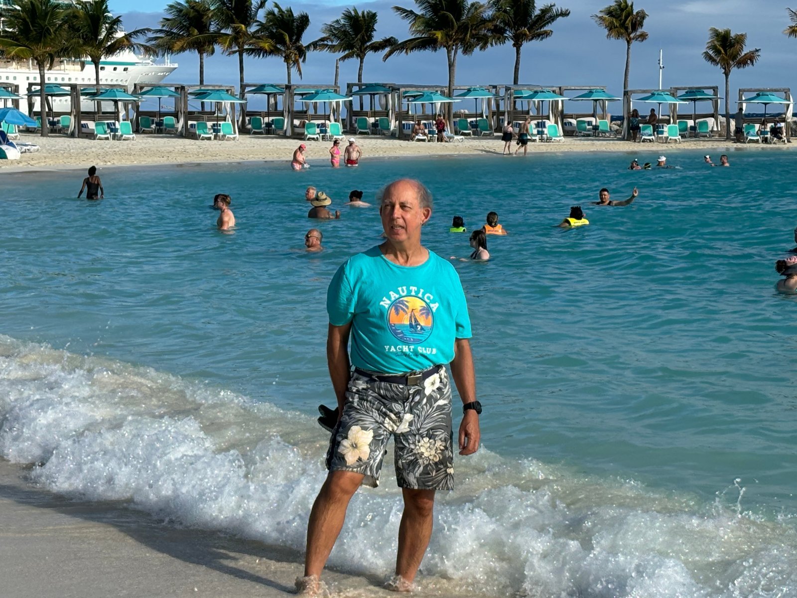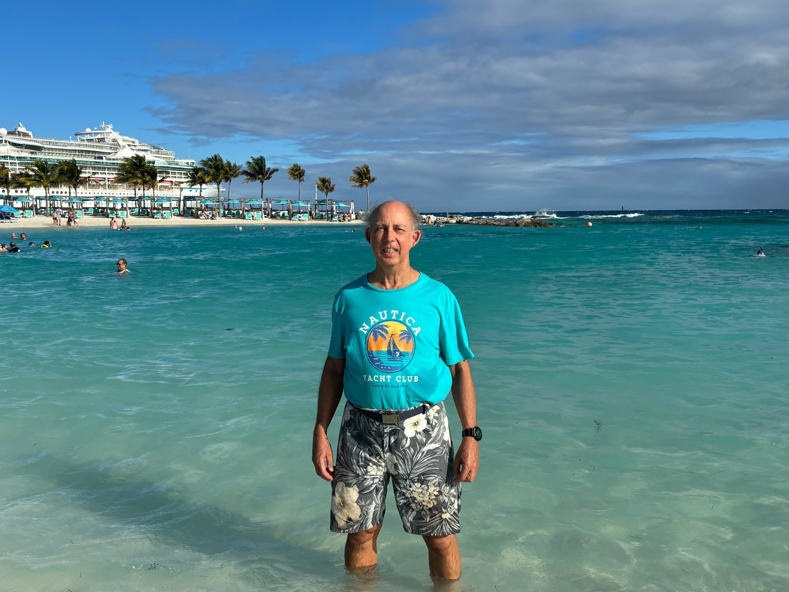 Winnie on an island resort privately owned by Royal Caribbean Lines . This was the last port visit of a ten-day Bahamas cruise. The island is developed as a themed water park. The port visit was advertised as "The perfect Day."