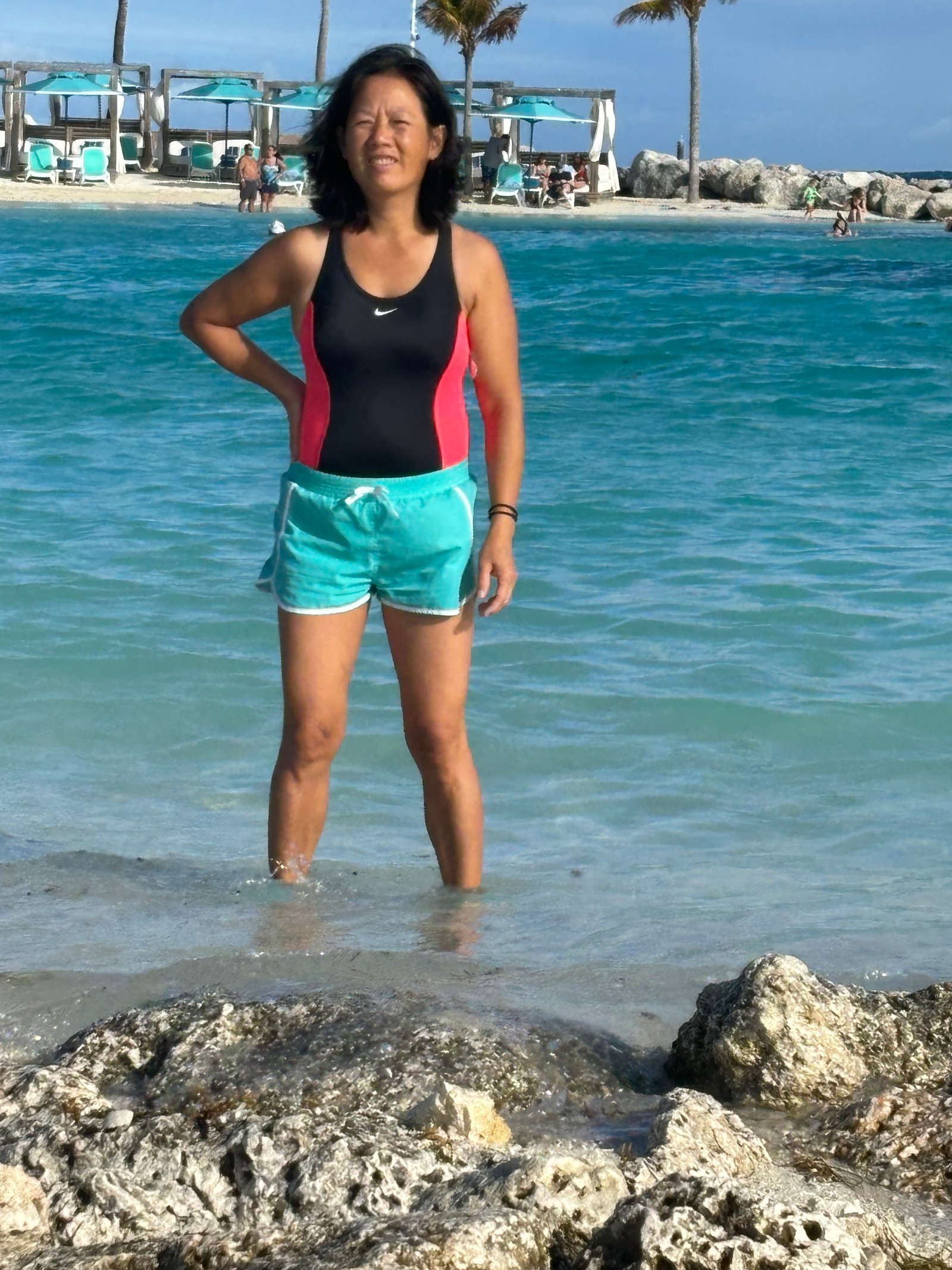 On an island resort privately owned by Royal Caribbean Lines . This was the last port visit of a ten-day Bahamas cruise. The island is developed as a themed water park. The port visit was advertised as "The perfect Day."