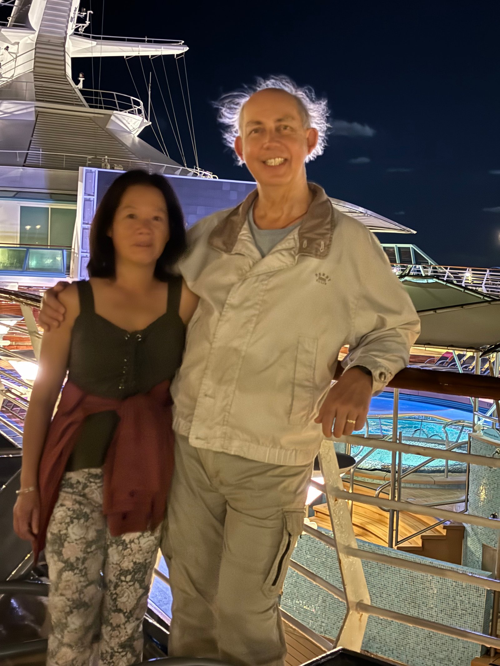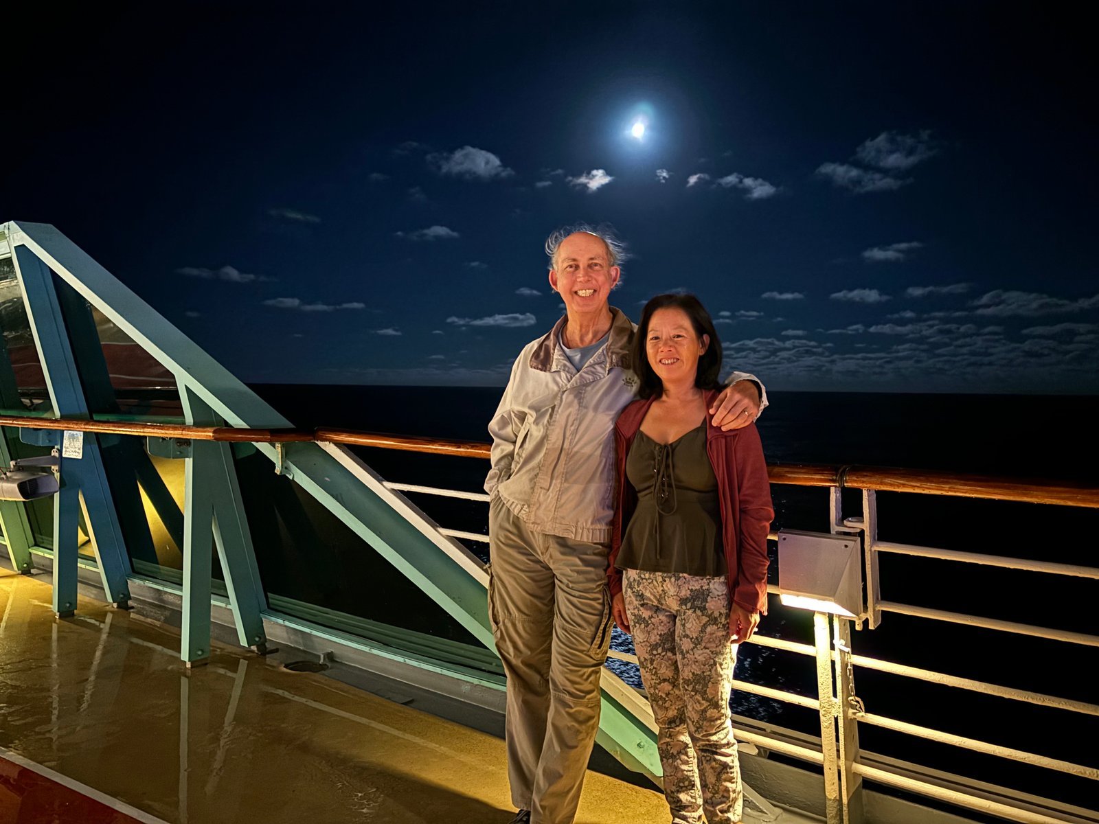Ron and Winnie's first vacation cruise, on the Royal Caribbean Lines "Vision of The Seas." Nighttime shot from the promenade deck, somewhere off the southern Atlantic coast.