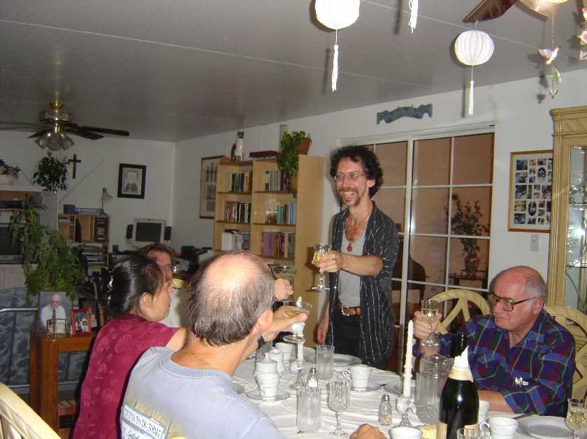 Winnie's second day in America. At dinner with Howard and Pam, Jeff, and Roger Forbes.