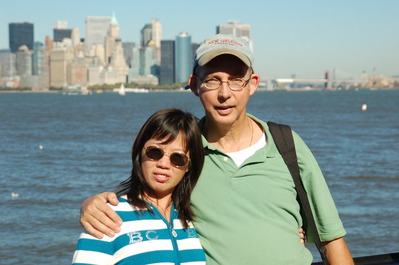 Ron and Winnie in New York City on the ferry crossing over to the Statue of Liberty in New York harbor