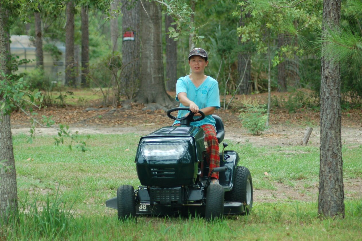 Winnie had not yet earner her actual drivers license when this photo was taken. Using our ride-on lawn mower was early drivers practice for her. Gautier, Mississippi
