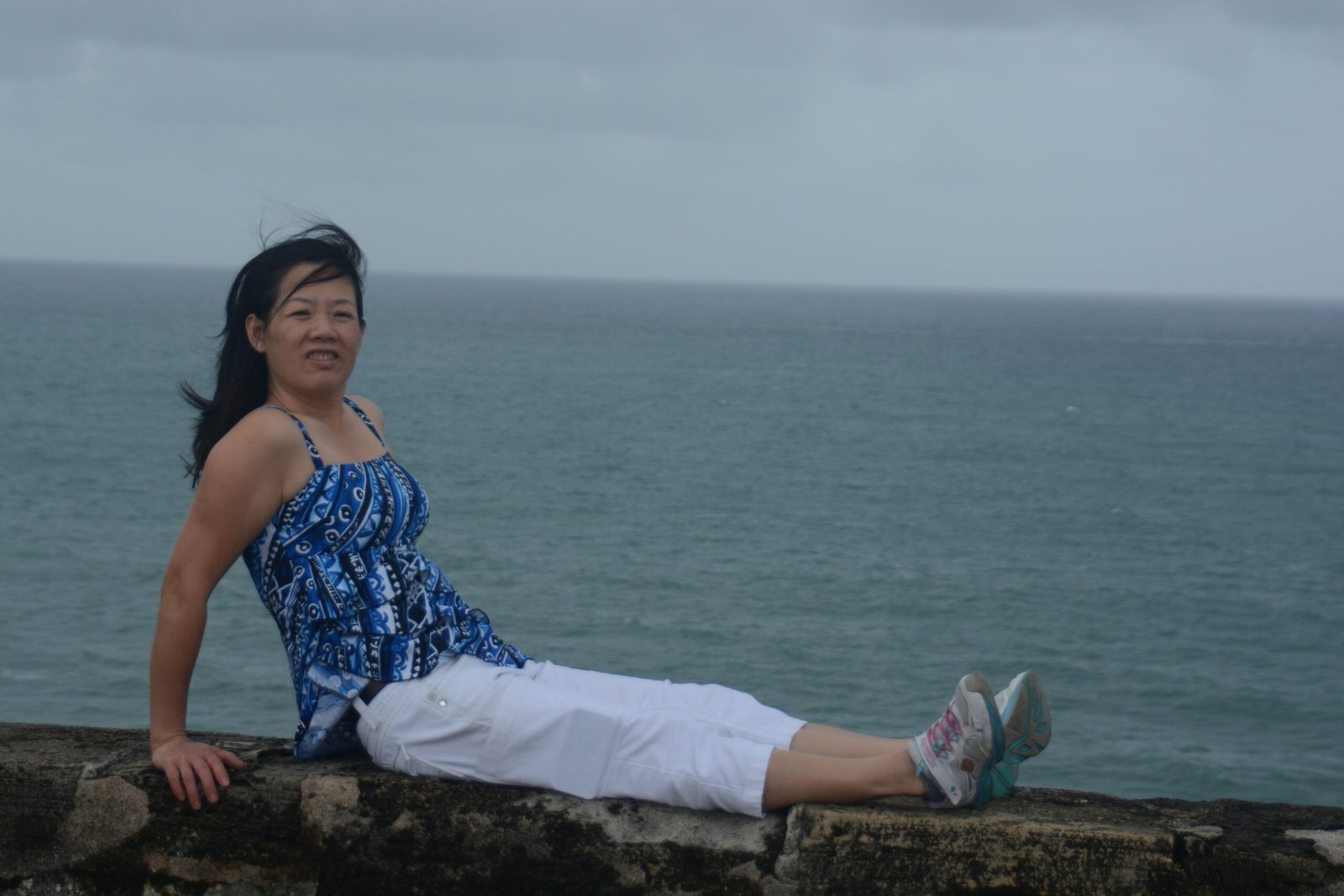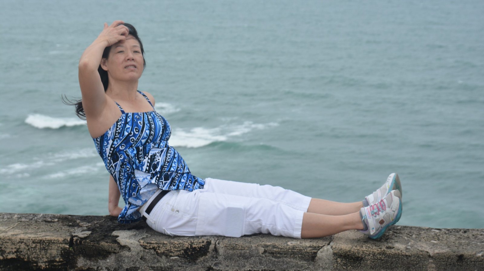 Winnie sitting on a colorful wall that runs along the edge of cliffs in the Miraflores District of Lima,. These cliffs run along the coast with pacific ocean beaches at the bottom.