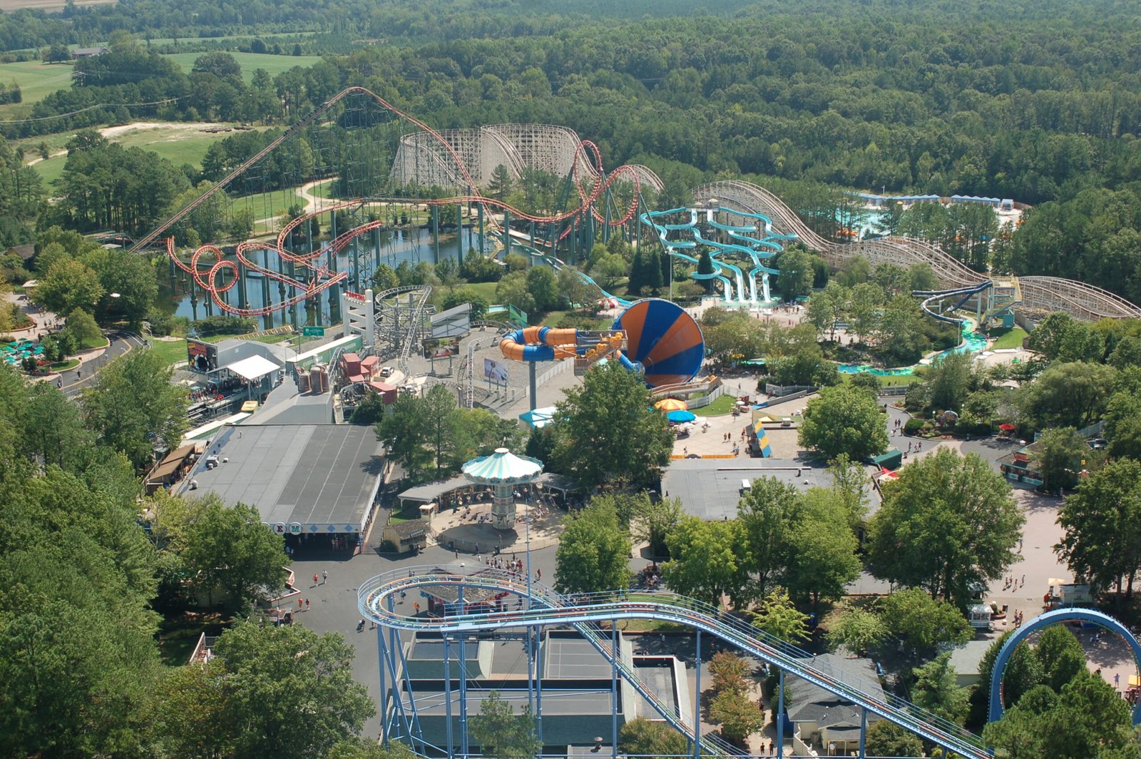 A view of the central area of King's Dominion Theme Park, Virginia. This park is a major regional tourist attraction.