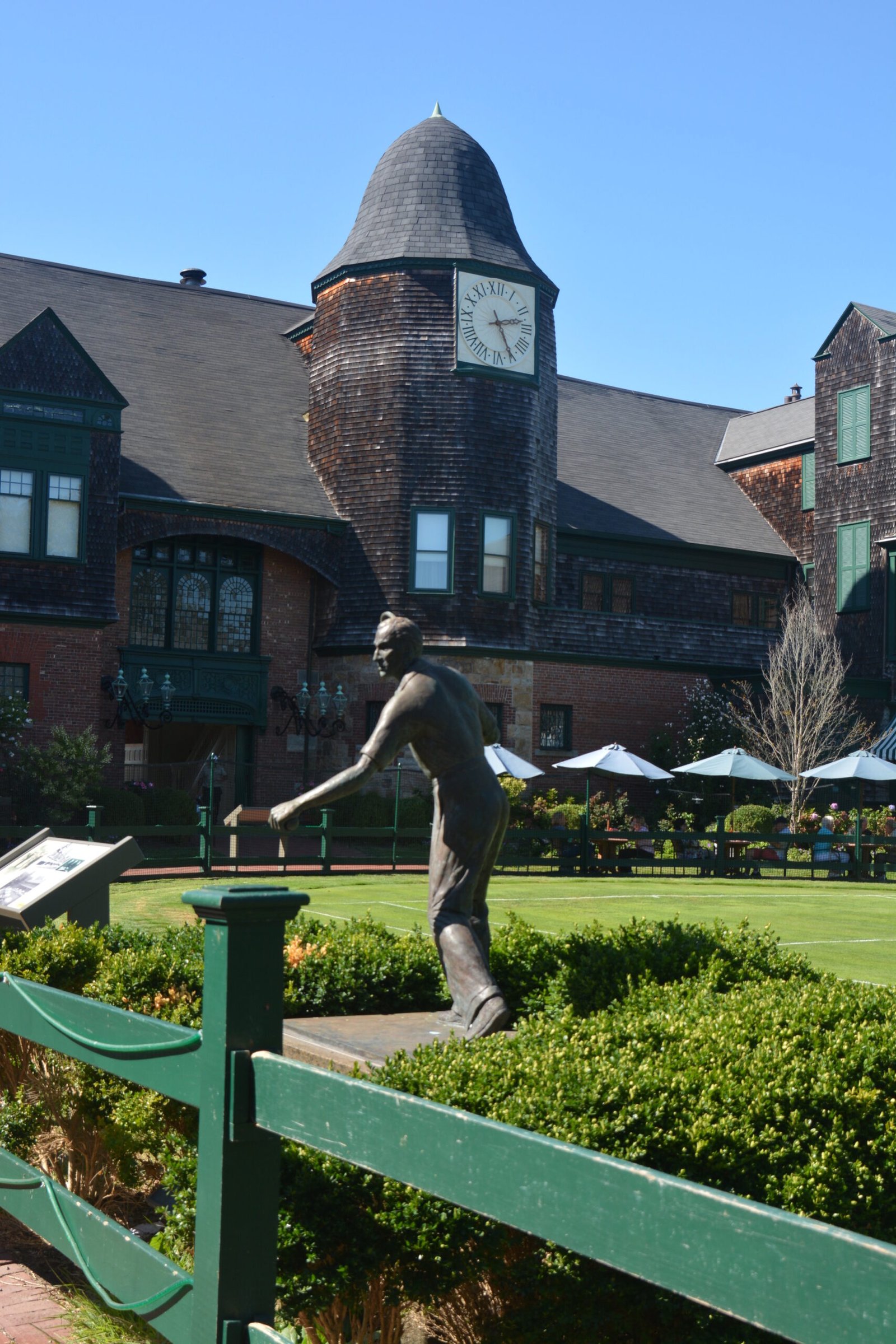 Looking across the greens at the clock tower in the International Tennis Hall of Fame and Museum, Narragansett, Rhode Island