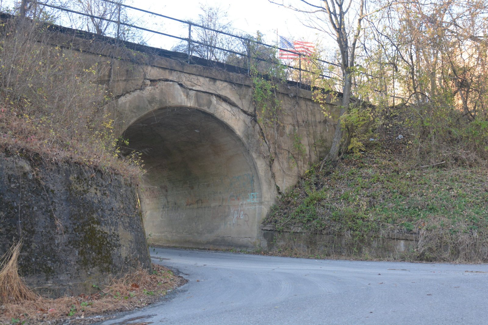 The masonry bridge for High Germany Road where it crosses over the road now leading to the Chesapeake and Ohio Canal National Historical Park, Little Orleans, Maryland. This bridge is marked with it's year of construction of 1904, and may have originally been built for the B & O Railway.