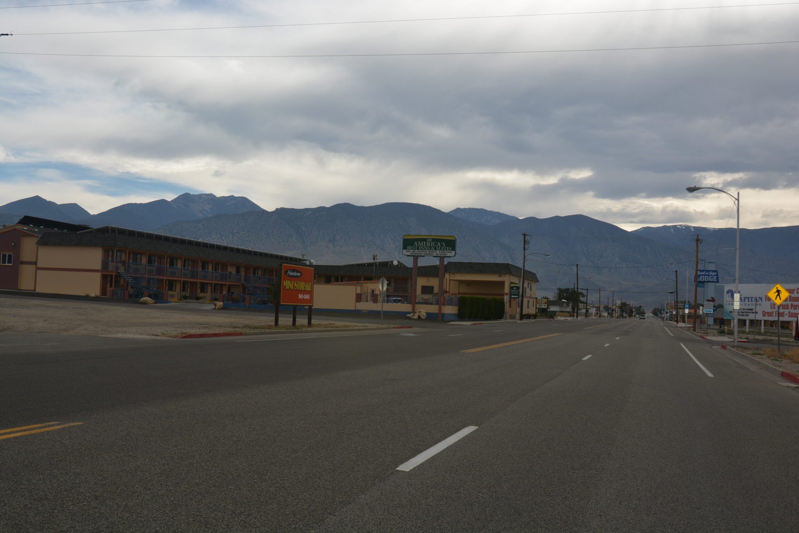The main street of Hawthorne, Nevada, on Veteran's Memorial Highway. This town exists between Walker Lake and the Hawthorne Army Depot Base, the largest munitions depot in the world.