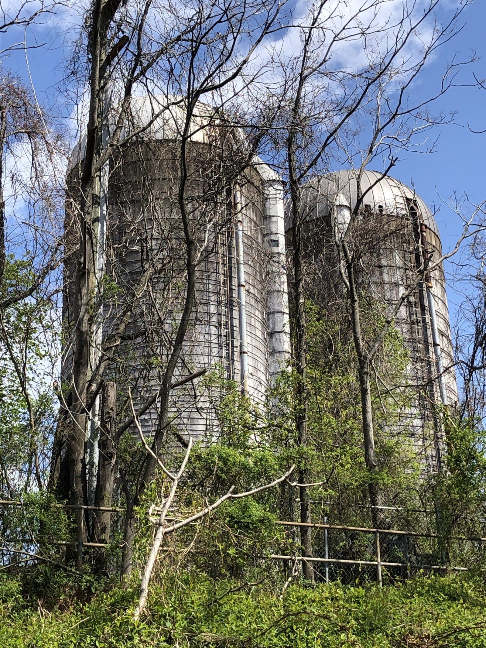 Old silos being gradually overgrown with bushes and trees. Along the cross-country trail, behind the Workhouse Arts Center, near Occoquan Regional park, Virginia.