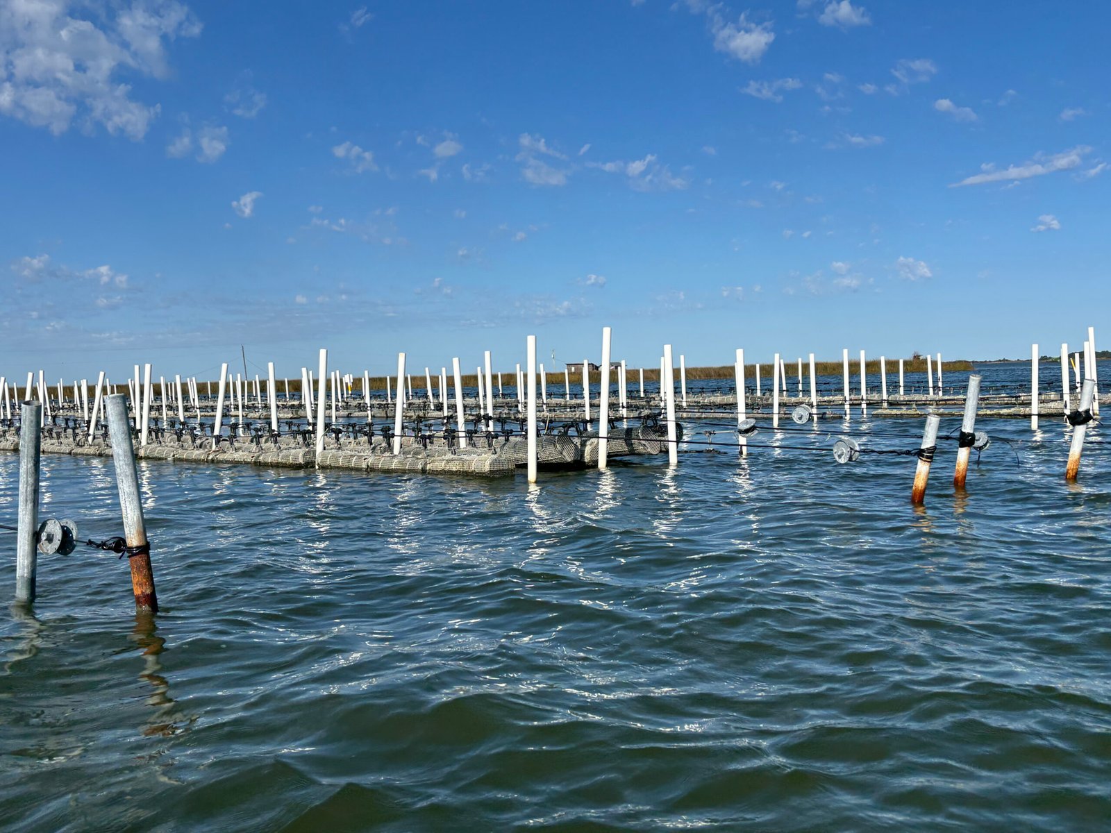 These posts support oyster cages, used for growing seed oysters. Once the oysters are at a sufficient size they will be released to form oyster beds. These oyster farms are used to restore former natural oyster beds which help clean bay eco-systems . This farm is located on Pamlico Sound near Oregon Inlet, Nags Head North Carolina.