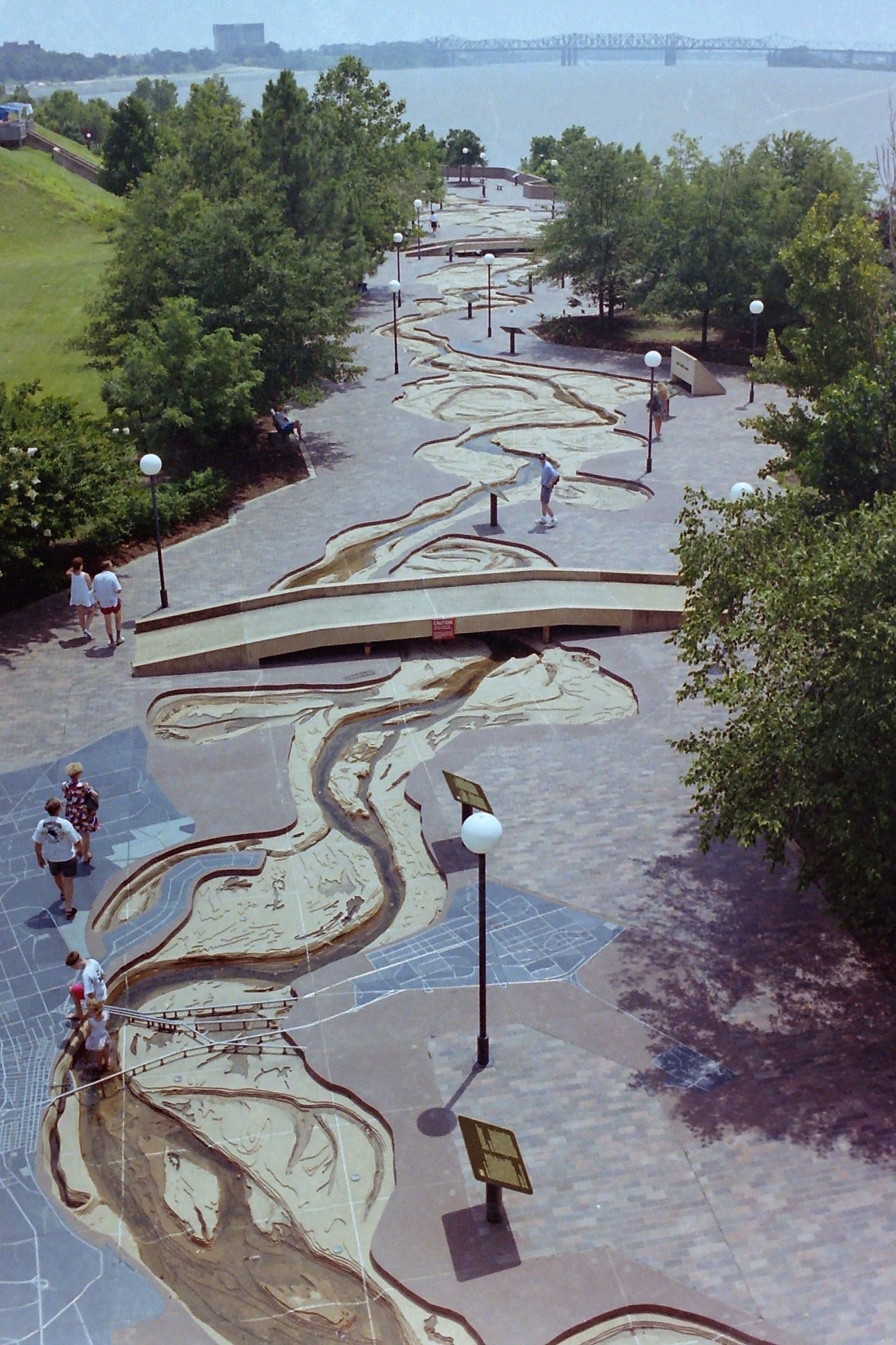 Mud Island, in the Mississippi River passing through Memphis, Tennessee, includes a scale 3-D map of the entire Mississippi River from her headwaters all the way down to the Gulf of mexico.