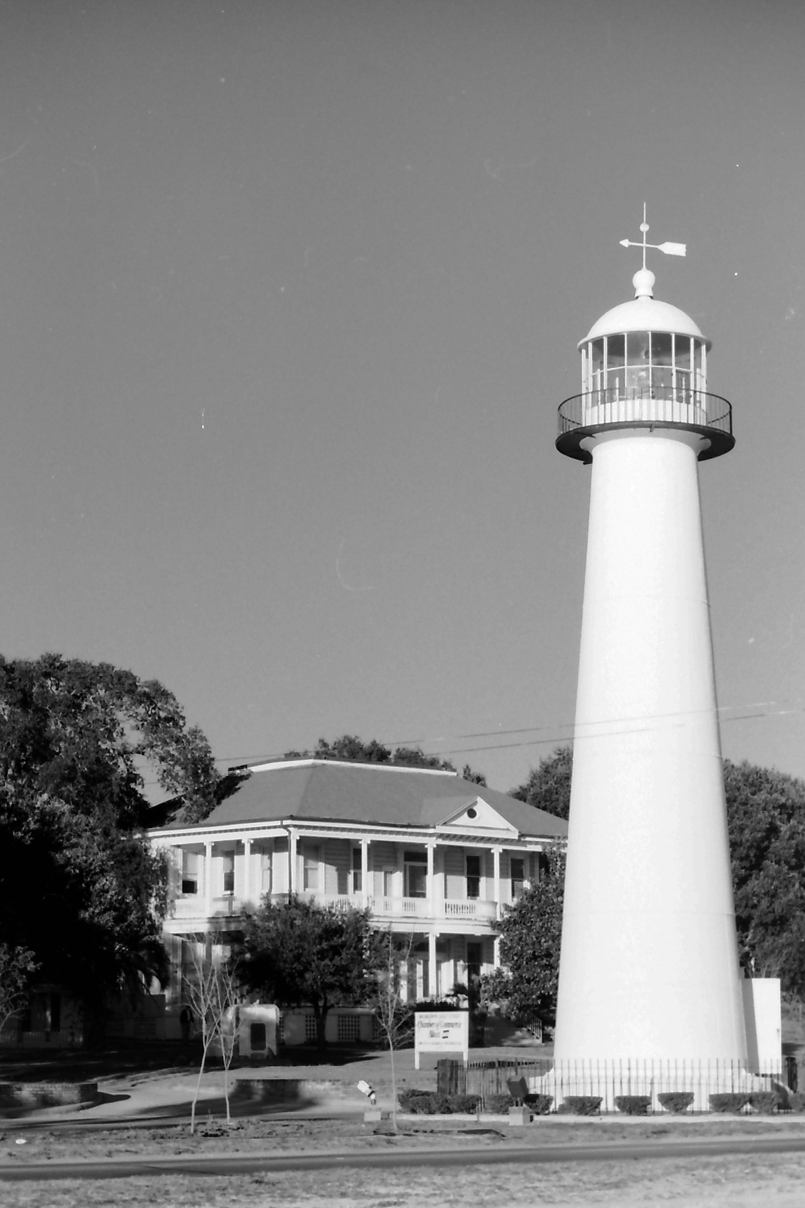 The old Biloxi lighthouse, Biloxi, Mississippi. This is an iron tower completed and placed in operation in 1848. It was listed on the National Register of Historic Places in 1973 and declared a Mississippi Landmark in 1987. The Biloxi visitor's center is in the background. Photo taken with Black & White 35mm film scanned to digital. August 1995