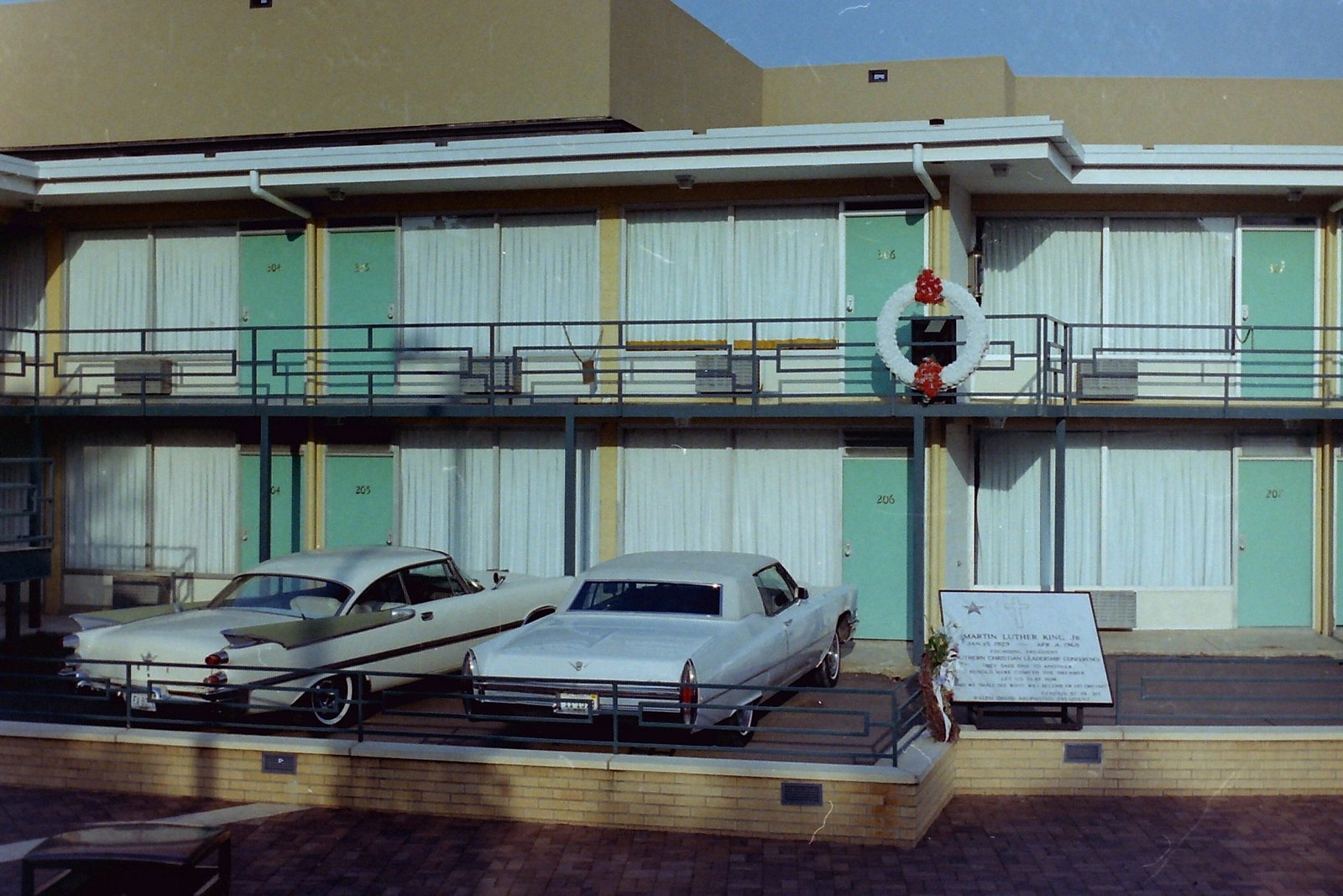 The Lorraine Motel, Memphis, Tennessee. Best known as the location where Dr. Martin Luther King, Jr., was assassinated. Now a civil rights museum. This is the balcony where Dr. King was killed, now recreated with period cars in the parking lot.