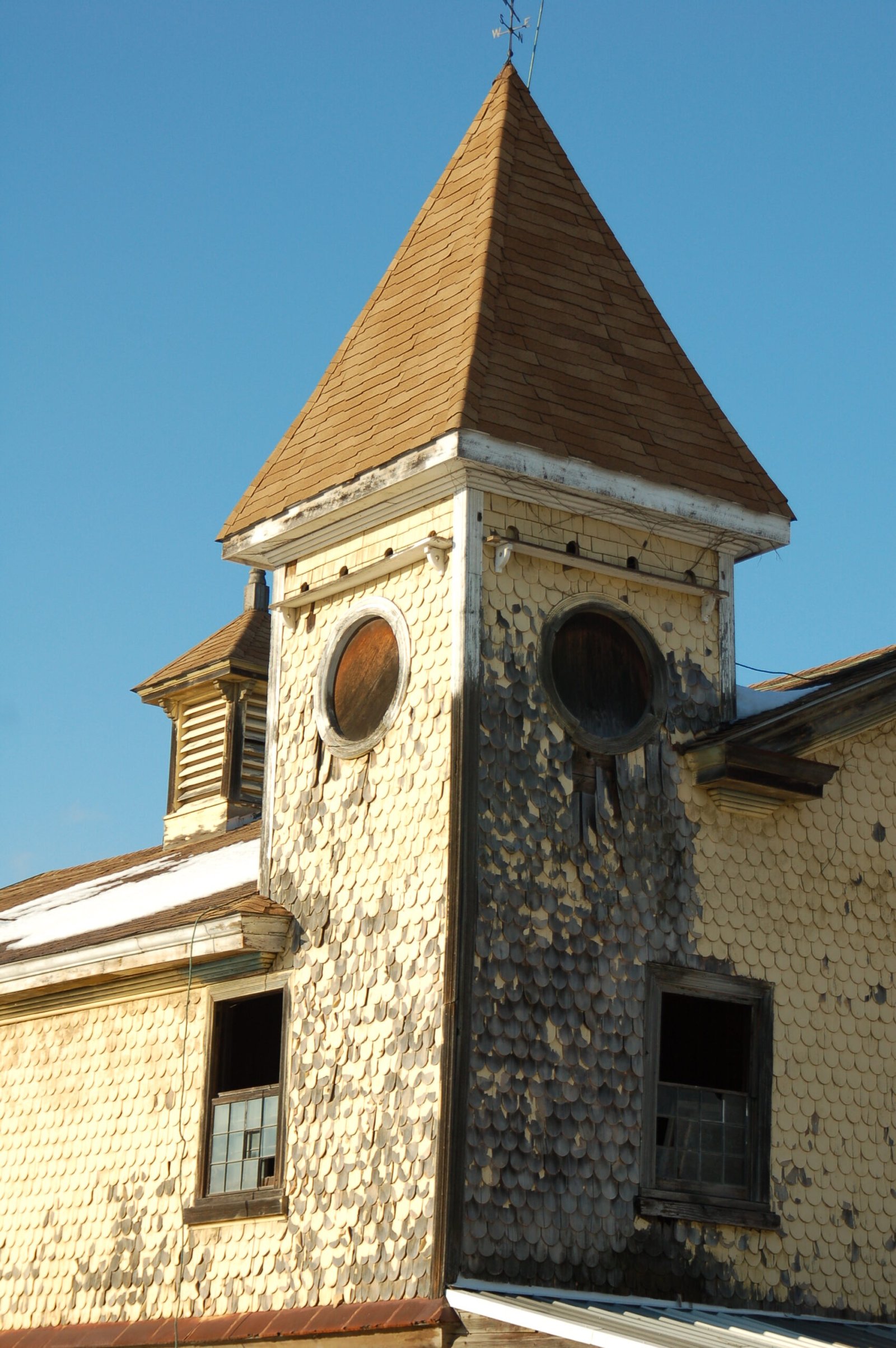A detail shot of the farmhouse tower
