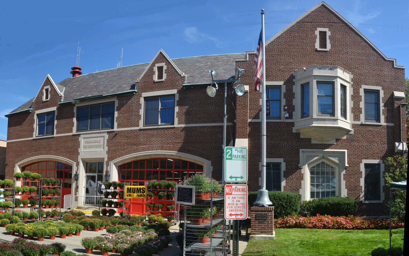 The main firehouse in Farmingdale, Long Island, New York. Built about 1929, and still in use as a fire station. On the day this photo was taken there was a street festival that blocked the fire station, so the driveway was used for a plant sale. Edited in Photoshop to create a composite panorama and remove power lines.