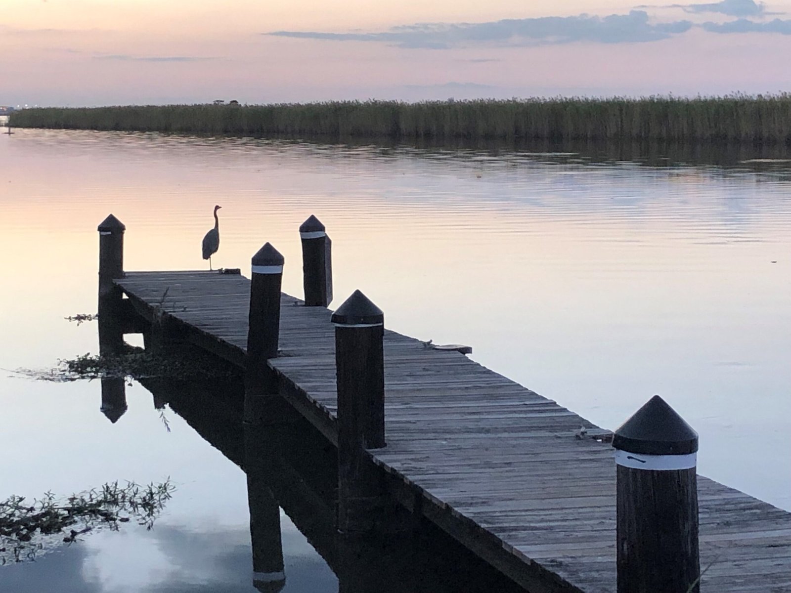 A heron on a pier on the eastern side of Mobile Bay, Alabama, looking west. Taken at the Bluegill Restaurant, one of several seafood places lining Mobile Bay.