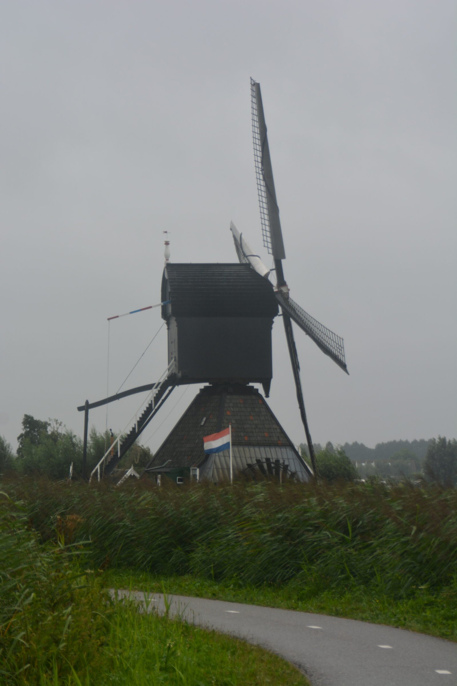 A departing view of the Blokweer Museum Mill. Also known as the "Blokweerse Wip," this is a traditional Dutch hollow post windmill used for water management in the polders.